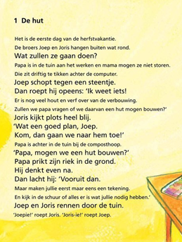 it is het ideale leren-lezen boek om samen in te lezen. De tekst voor de beginnende lezer (AVI-E3) is in een groter lettertype geschreven en tussen door staan zinnen (AVI-E5) die de gevorderde lezer kan lezen. Dit kan op school wanneer bijvoorbeeld kinderen uit groep 7 of 8 helpen bij het lezen met kinderen uit groep 3 of 4, maar dit kan natuurlijk ook thuis met papa of mama.
