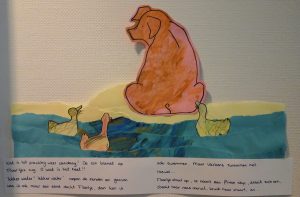 Vervolgens heb ik het blad zo in stukken gescheurd dat ik alle gescheurde stukjes als ‘spetters’ op kon plakken. Hier na hoefde ik alleen nog maar het varkentje en de eender tussen de ‘spetters’ op te plakken. - Als alles is samengesteld en opgeplakt en de tekst is opgeschreven hoef je alleen nog maar een plekje te zoeken waar je het kunt ophangen. Zoek een plekje waar de kinderen het goed kunnen zijn. Ik heb in de tijd dit verhaaltje boven de kapstok in de gang opgehangen. Bij het wegbrengen en ophalen van de kinderen wilden de kinderen het verhaaltje vaak graag even aan papa of mama vertellen.