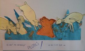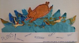 TIP: zijn de tekeningen wat kleiner, knip ze dan niet van te voren uit. Dit maakt het makkelijker om ze in de kleuren of te beschilderen. Kinderen kunnen lekker buiten de lijntjes krassen of kliederen. Als je de tekeningen daarna uitknipt ziet het er toch netjes uit.- Als alle elementen zijn gemaakt is het tijd om de strip echt samen te gaan voegen. Je begint met de achtergrond. Dit kan een groot vel zijn per fragment. In het boek “Plons” dat ik hier steeds gebruikt hebt in de voorbeelden, springt het varken plotseling in de vijver, en alles spettert alle kanten op. Ik wilde dit niet gedetailleerd schilderen. Ik heb kinderen daarom met voornamelijk blauwe verf op een licht blauw vel laten schilderen.